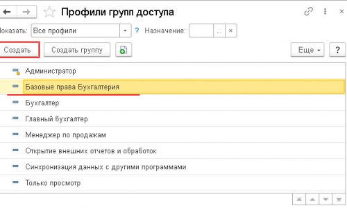 В разделе Администрирование — Настройки пользователей и прав — Профили групп доступа можно добавить любую роль, например, я добавляю Базовые права Бухгалтерия.