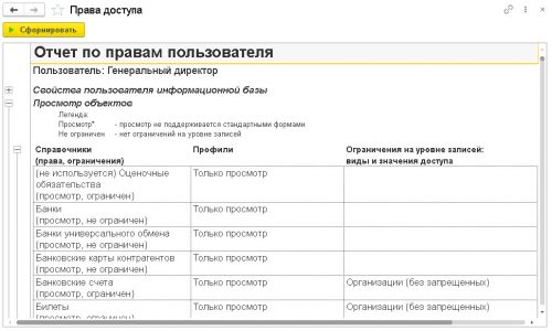 Отчет по выбранному профилю покажет доступность справочников, документов и регистров.