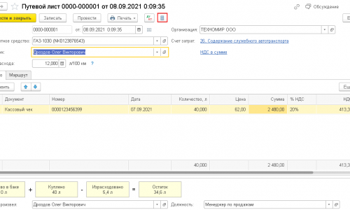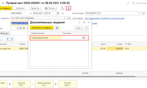 Теперь в карточке Путевого листа вы сможете заполнять нужную информацию. Это в том случае, если заправка бензина не совпадает с покупкой бензина (реквизит есть в форме Путевого листа и обычно покупка и воспринимается как заправка бензином машины).