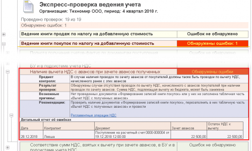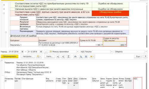 Добрый день! При проведении экспресс-проверки ведения учета, выдает ошибку: сумма по кредиту 76.АВ не совпадает с суммой по регистру «НДС покупки». Проверила регистр, сумма совпадает, только она разбита на две суммы: в октябре принят к вычету НДС с аванса, в ноябре-был возврат аванса и остаток суммы принят к вычету в ноябре. Как возможно исправить эту ошибку? Скрины прилагаю. Спасибо!