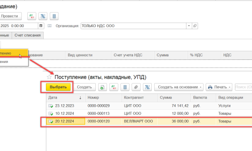 По кнопке Заполнить по поступлению — выберите нужное поступление