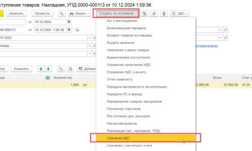 Документ в 1С Списание НДС, его можно создать двумя способами: