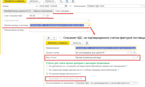 Прочие доходы и расходы: Списание НДС, не подтвержденного счетом-фактурой поставщика (настройка статьи не НУ).