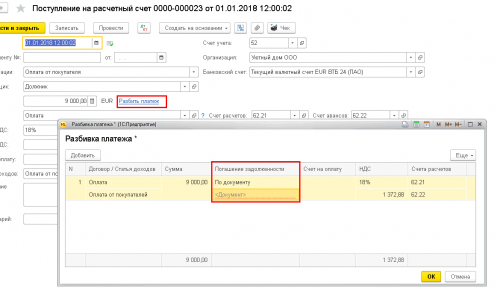 Здравствуйте, Ольга! Возможно, не совсем поняла расклад по цифрам. Если пришла оплата одним платежом — часть аванс и часть постоплата, то нужно в выписке разбить платеж на 2 строки и там, где постоплата выбрать Погашение задолженность — По документу и выбрать документ отгрузки (скрин)