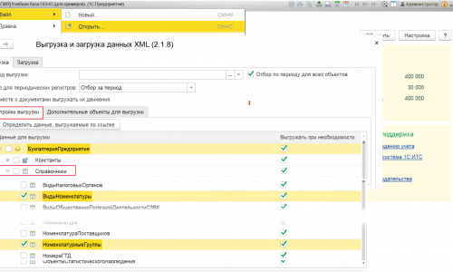 Для выгрузки и загрузки данных необходимо выполнить следующие действия. Главное меню — Файл — Открыть файл выбираете внешнюю обработку Выгрузка и загрузка данных XML 8.3.epf. После запуска обработки на вкладке Выгрузка — Настройки выгрузки выбираете Справочники и указываете те справочники, которые хотите выгрузить, указываете путь где будет надо сохранить файл с выгруженными данными далее кнопка — Выгрузить данные.