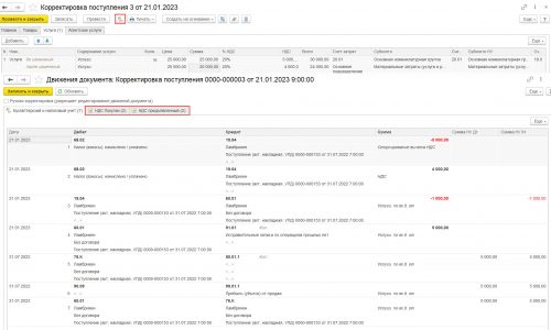 Вкладка — НДС Покупки есть в проводках документа Корректировка поступления.