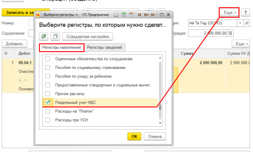 Так как поступление вновь созданного ОС оформлялось документом Операция, введенная вручную, вам также вручную придется добавить запись в соответствующий регистр. Для этого в документе Операция в шапке по кнопке Ещё найдите Выбор регистров, а среди регистров накопления — Раздельный учет НДС (рис.)