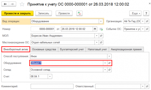 После этого можно создавать документ Принятие к учету ОС. На вкладке Внеоборотный актив указать оприходованный внеоборотный актив (рис.4).