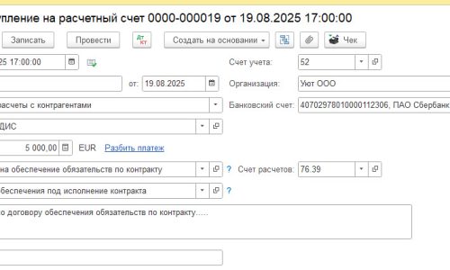 Здравствуйте! Программа 1С 8.3 КОРП. релиз 173.23. Наша компания — поставщик импортного товара, заключила договор поставки с покупателем в у. е. (ЕВРО). Покупатель также подписал с нами соглашение об обеспечительном платеже, что другая организация оплатит предоплату по этому договору, и в случае если до 15.09.25 оплату за товар не произведет наш покупатель, то обеспечительный платеж от другой организации засчитывается в счет оплаты долга за товар. Прошу пояснить — в момент получения предоплаты от другого лица как это отразить в 1С? НДС же не нужно начислять с аванса до 15.09.25, это не является авансом.