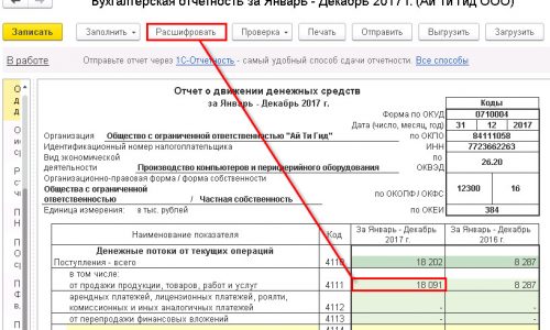 Что касается очищения выручки от НДС, при заполнении отчета ДДС программа производит его автоматически. Проконтролировать данную операцию можно встав курсором на соответствующую строку (н-р, 4111) и нажав кнопку Расшифровать (рис.3)