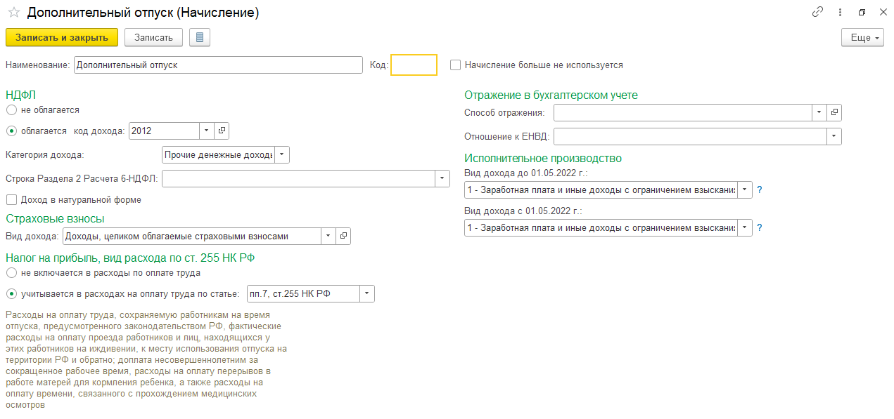 Дополнительный отпуск тоже необходимо создать в разделе Зарплата и кадры — Справочники и настройки — Настройки зарплаты — Расчет зарплаты — Начисление.