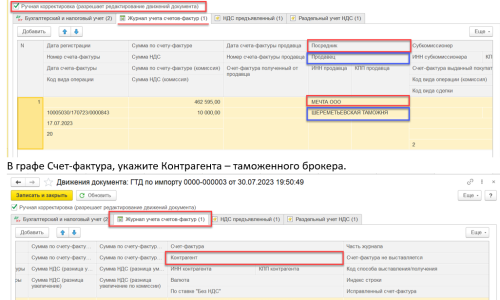 А в графе Счет-фактура, укажите Контрагента – таможенного брокера.