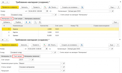 В табличной части указываете материалы. На закладке Счет затрат указываете счет на который списываете материалы 20.01