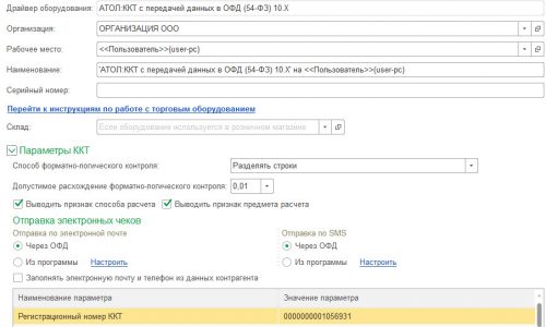 Ирина, пришлите пожалуйста скриншот, где видно что конкретно показывает программа. Также нужны параметры фискального устройства (Администрирование—>Подключаемое оборудование—> ККТ с передачей данных—>Ваша модель ККТ—> Параметры (см. скриншот). А если вышлите модель ККТ и версию прошивки ККТ — будет просто замечательно. Как это узнать — лучше спросить у системного администратора или обслуживающей Вашу ККТ организацию. Нужен диагностический чек примерно такого вида — вложение.