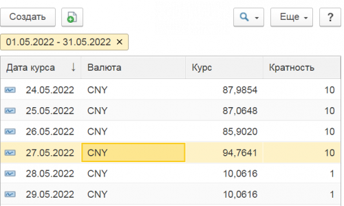 И еще Справочники — Валюты. Найти CNY и приложить перечень Курсы валют за май, чтобы было видно 27.05. Свой пример прилагаю.