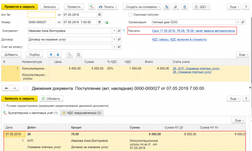 Спасибо, Татьяна. А пример Поступления (акт, накладная) с формированными проводками можно попросить вас?