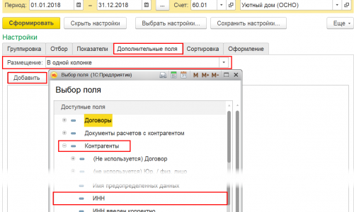 Например, в ОСВ по счету 60 в окне Выбор поля раскрыть реквизиты элемента Контрагенты, нажав на +. Выбираем «ИНН», нажимаем «ОК». В поле «Размещение» выбираем способ вывода дополнительных данных:
