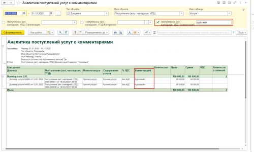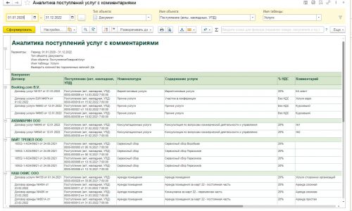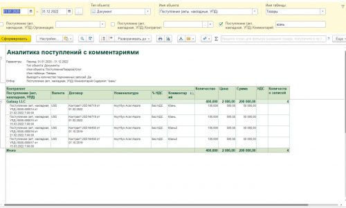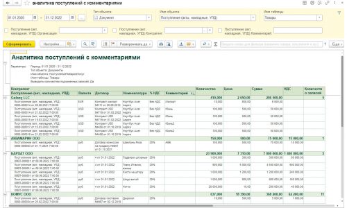 Существует ли отчет по поступлениям? Сортировка по содержанию комментарий, с развернутыми данными номенклатуры (в группе поступлений) поступлений с количеством, ценой, НДС, суммой?