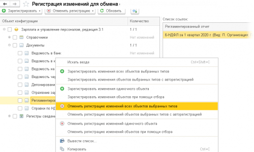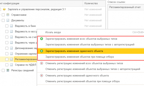 Количество зарегистрированных изменений по строчке «Регламентированный отчет» справа очистится. Это значит, что данные выгружены в бухгалтерию не будут, поскольку выгружаются только изменения по данным из ЗУП.