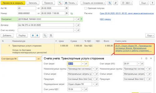 В этом случае, подойдет документ Потупление (акт, накладная) вид операции Услуги. Там можно в полном объеме указать все субконто по счету 20.01 (рис.1).