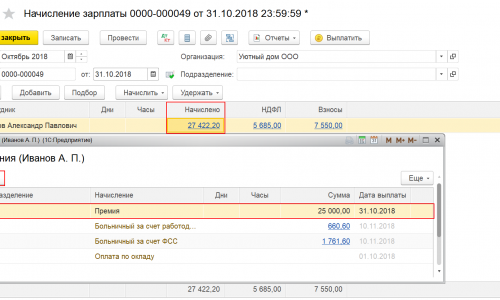 2. Оформить документ Начисление зарплаты. В табличной части начислений у сотрудников, которым необходимо начислить премию и добавить вид начисления – Премия и указать сумму начисленной премии.