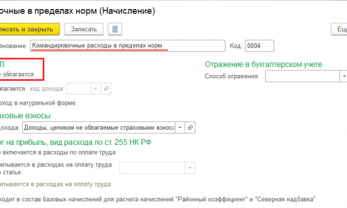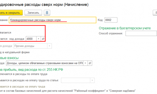 3. Если бы были командировочные сверх нормы, то вам пришлось бы опять-таки самостоятельно оформить другое начисление «Командировочные расходы сверх норм» и включать его в зарплату. Если новый вид начисления вы заполните как показано на рисунке, все данные по НДФЛ с разницы и взносы рассчитаются автоматически.