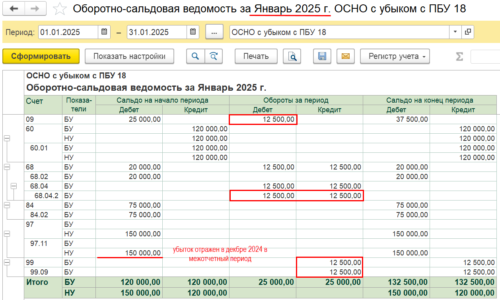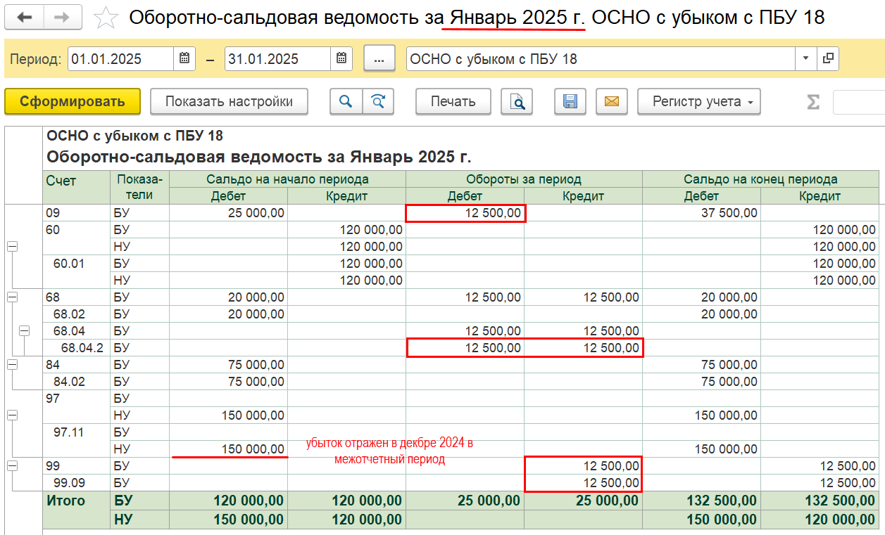 вчера мы перенесли дату Операции по отражению убытков в НУ с 01.07.2025г. на 31.12.2024г., картина немного изменилась, счет 09 закрывается полностью, но конечный итог смущает.