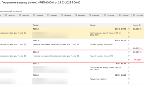 Скорректируйте вручную движения документа Поступление в лизинг: