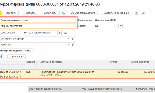 Перенос аванса покупателя Организации, которая будет исполнять обязанности по полученному авансу документ Корректировка долга: