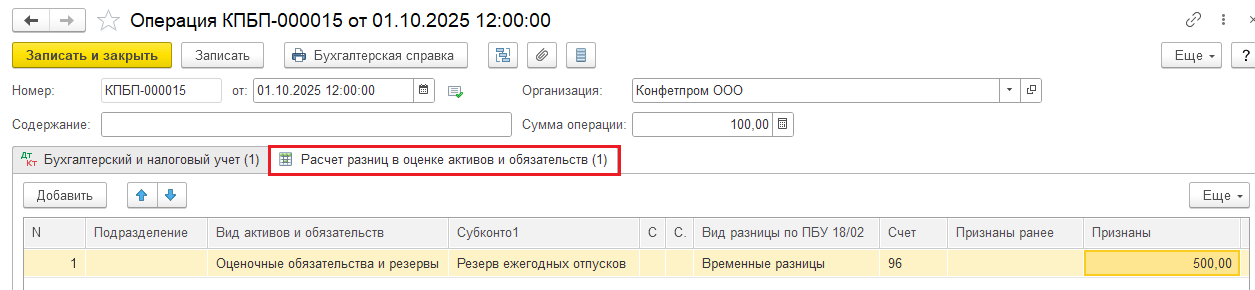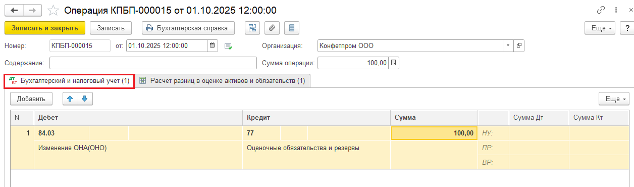 И дополнительно в документе Операция зайти справа в меню Еще — Выбор регистров и добавить регистр сведений Расчет разниц в оценке активов и обязательств: