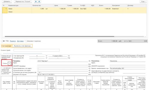 После проведения счета-фактуры данная функция становится возможной, но тогда печатная форма УПД содержит статус 1 и номер документа выводится на печать не реализации, а счета-фактуры.