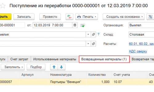 После ознакомления потенциальных покупателей с продукцией, не зависимо от того будут выкупаться образец или нет необходимо оформить документ Поступление из переработки. В документе заполнить вкладку Возвращаемые материалов.