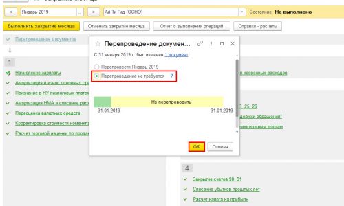 Если программа запрашивает перепроведение документов, установите переключатель в положение Перепроведение не требуется (рис. 1)