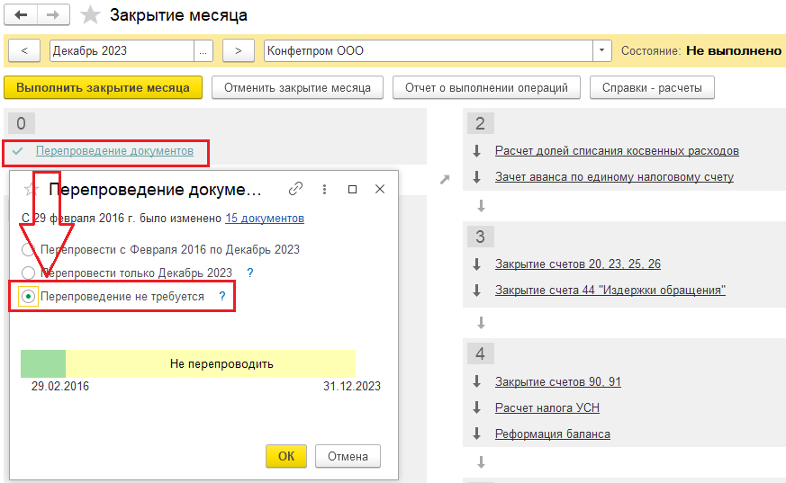 Потом необходимо будет зайти в закрытие месяца, если программа предложит перепровести документы с декабря 2023, то перепроведение необходимо будет пропустить: