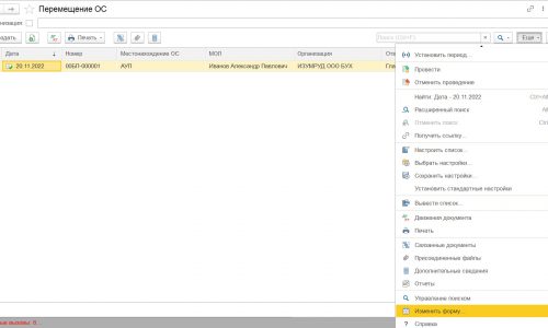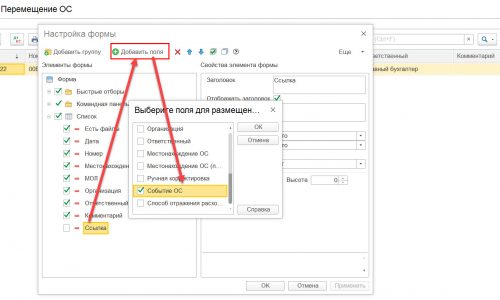 Чтобы удобнее было смотреть события и не входить в каждый документ, вы можете в журнале Перемещения ОС — кн. ЕЩЕ — Изменить форму вывести колонку с событием в Журнал, как показано у меня в скринах: встаете на поле Ссылка — кн. Добавить поле — флаг на событие ОС.