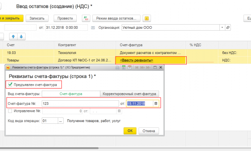 Добрый день! С 01.01.2019 года вручную заносим остатки в 1 с 8.3. Вопрос: как правильно отразить НДС, перенесенный с 4 кв.2018 по ставке 18% на 1 кв. 2019?