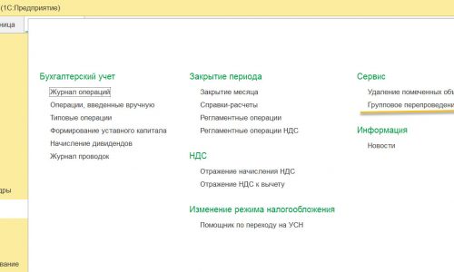 2. Раздел Операция — Сервис — Групповое перепроведение документов.