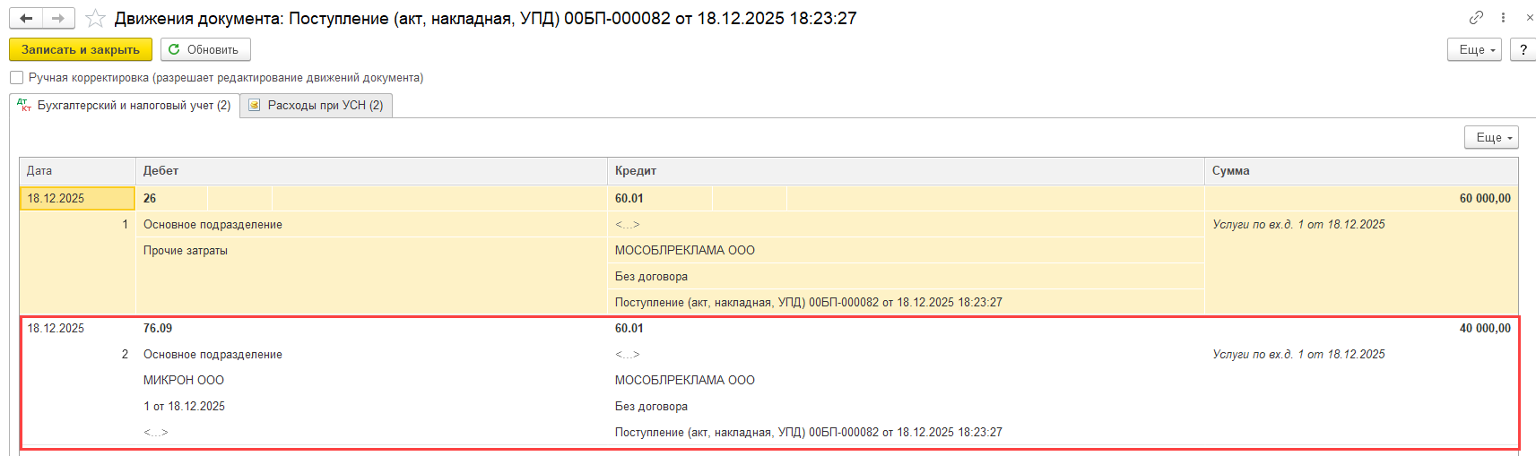 2. Вытащили долю второго собственника (40%) через операции введенные вручную. Проводки: Дт 76 Кт 26- 40 тыс. Скрин 2.