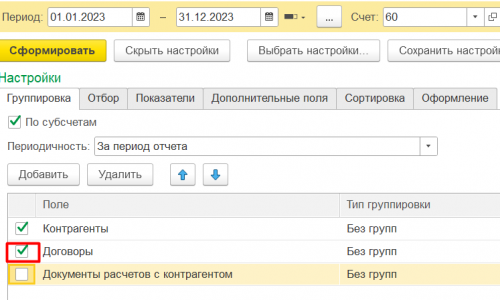 Чтобы сопоставлять данные отчетов в программе необходимо, чтобы отчеты были с одинаковыми настройками. Например, слева выведен отчет в разрезе контрагентов и договоров, а справа только в разрезе контрагентов.