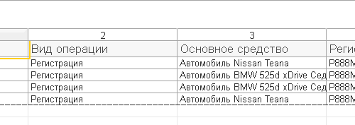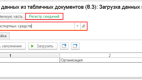 По кнопке Открыть (желтая папочка) выбираете файл Excel со списком транспортных средств из регистра 1С 2.0. У вас на вкладке Табличный документ появляется загруженная таблица.