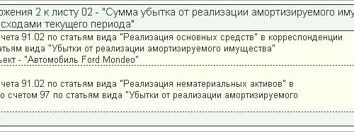 — оборот Дт 91.02 Вид статьи Реализация основных средств Кт 97.21 Вид для НУ — Убытки от реализации амортизируемого имущества»