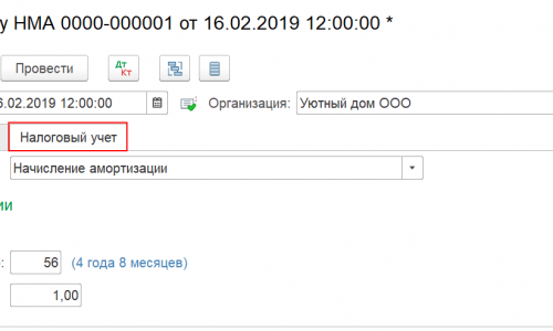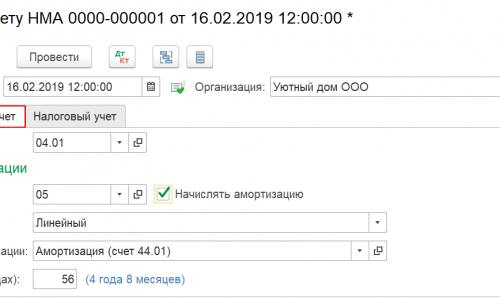 На вкладке Бухгалтерский учет укажите Срок полезного использования (в месяцах) — 1 месяц.