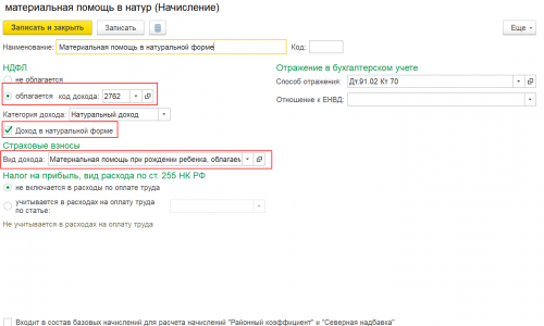 Заонодатель не запрещает выплату материальной помощи, в том числе и Материальной помощь при рождении ребенка выплачивать в натуральном форме. В программе создайте новый вид начисления поставьте фложок — Доход в натуральной форме. Облагать такой подарок НДФЛ и страховыми взносами будет только в сумме свыше 50 000 руб. В вашем случае облагаться будет 10 000 руб. Более подробно, как начислить материальную помощь при рождении ребенка посмотрите здесь: Материальная помощь при рождении ребенка .