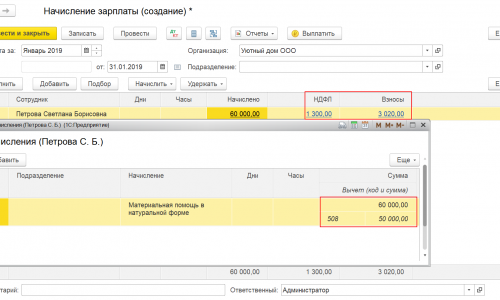 То при начислении материальной помощи вычет делается автоматически по коду дохода и НДФЛ и взносы будут рассчитываться только с суммы превышающей 50 000 руб.