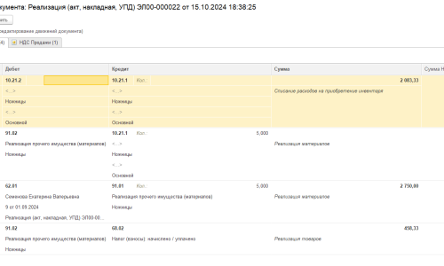 Если можно, приложите скрины, как оформлено поступление и реализация, с проводками ДтКт.