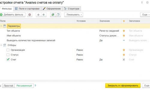 Настройки по вкладкам привожу, но вам самостоятельно сделать настройку будет сложно, там есть скрытые формулы, введенные через настройку Технического специалиста для отражения только документов счет покупателю.