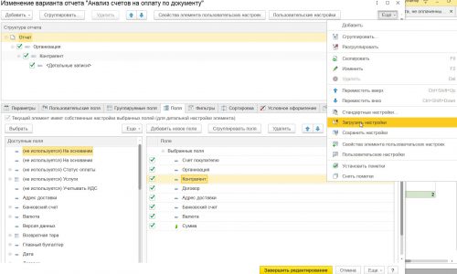Поэтому загрузите настройку у себя в базе: раздел Отчеты — Универсальный отчет — Настройки — кн. ЕЩЕ (внизу) — Настройки для Технического специалиста — ЕЩЕ (верхнее) — Загрузить настройки.