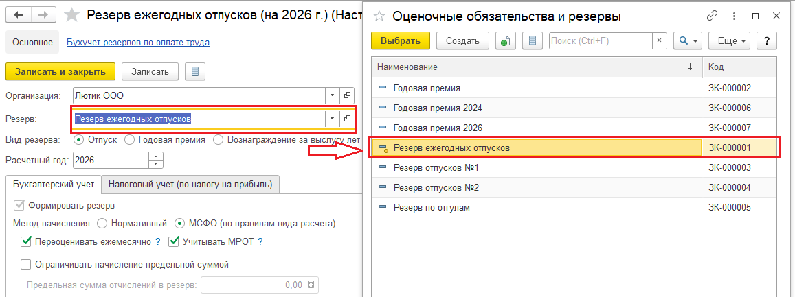 Добрый день! Скорее всего при создании настройки по резервам на 2026 год создали новый элемент справочника Оценочные обязательства и резервы, а не выбрали типовой: