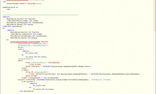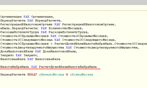 А вот кусочек кода Справка-расчет распределения прибыли по бюджетам субъектов РФ, он собирает данные из бухгалтерского регистра Хозрасчетный и РегистрСведений.РасчетДолейБазыНалогаНаПрибыль.