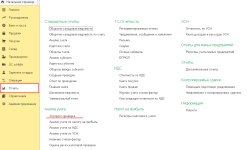 Экспресс-проверка находится в разделе Отчеты — Анализ учета.